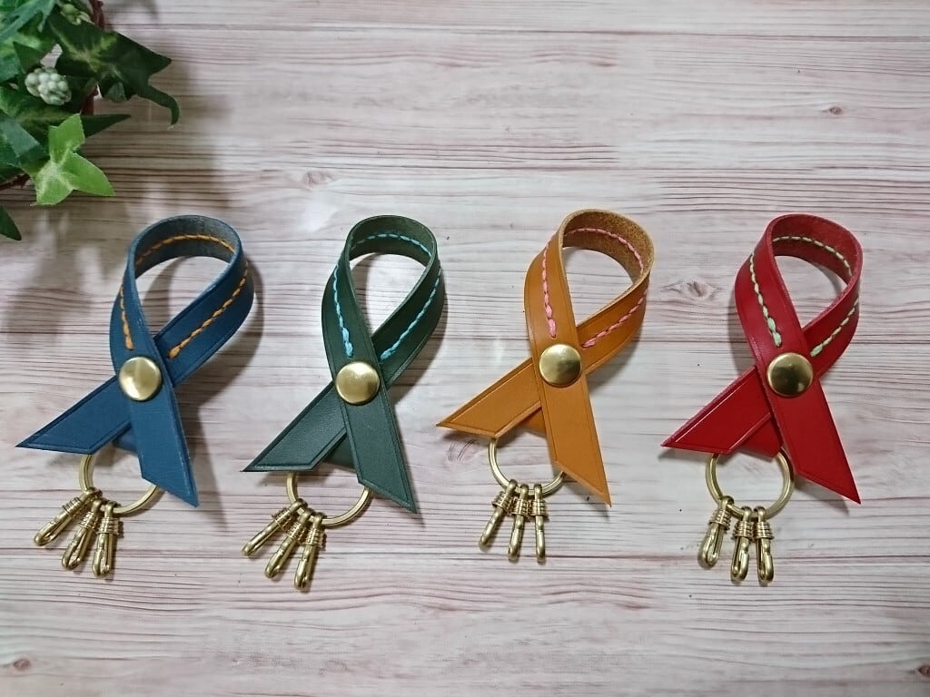 栃木レザー(国産のタンニン鞣しヌメ革)で製作したリボンをイメージしたキーホルダーです。